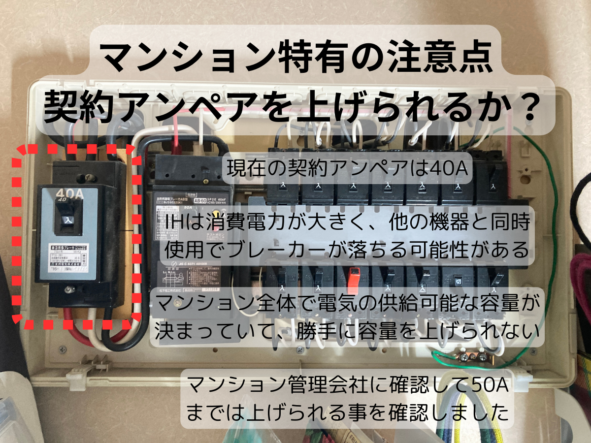 今の契約アンペアが40Aで、IHは消費電力が大きく電子レンジやエアコンなど他の機器類と同時使用でブレーカーが落ちる可能性があります。
