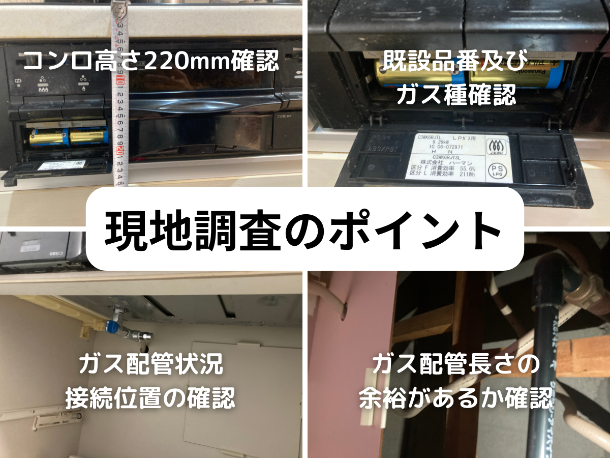 ・ガス配管の状況、材質、接続位置の確認をします。特に現状が金属フレキ管で接続されている場合、再利用できないので注意が必要です。