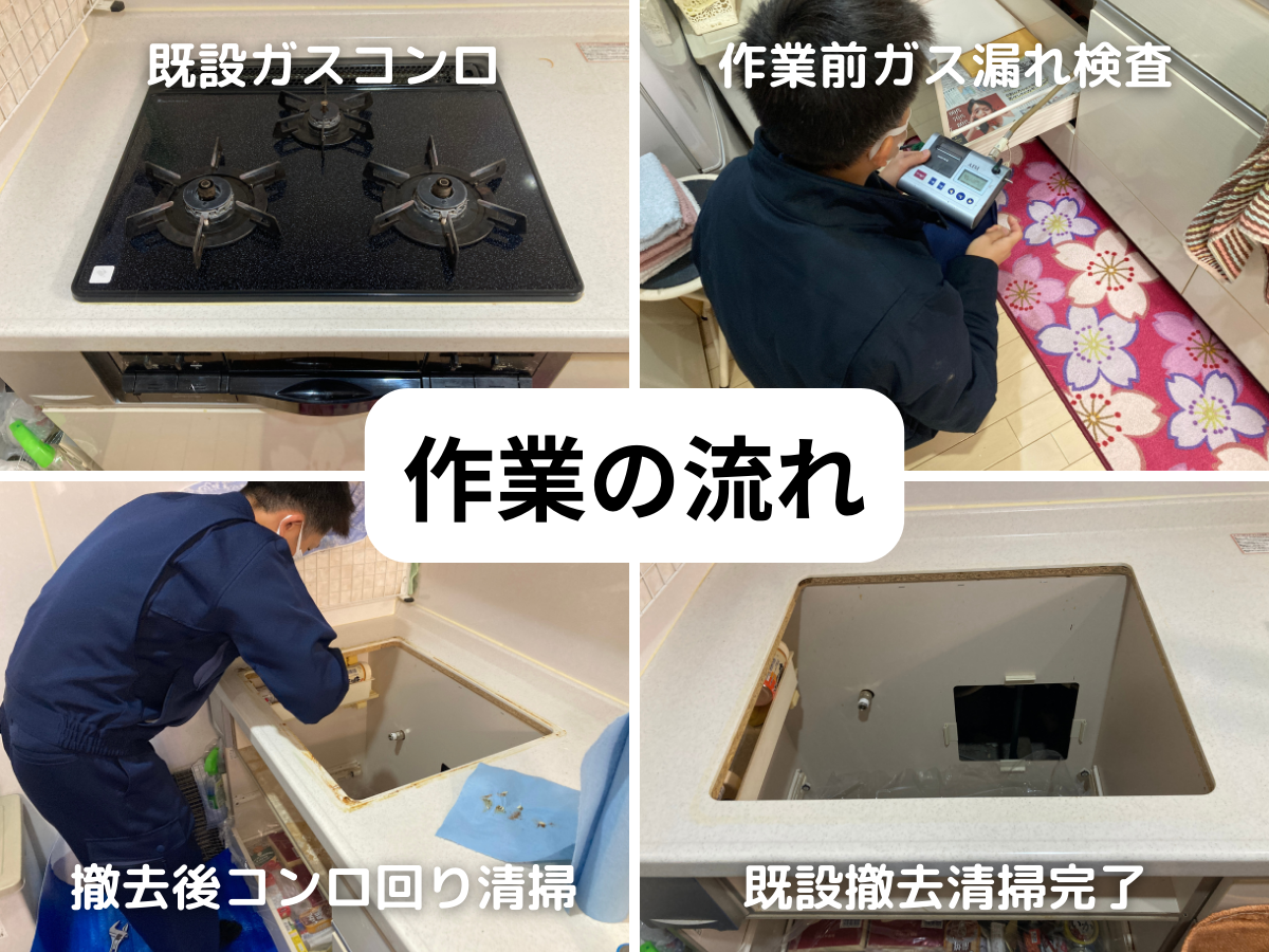 ・作業前点検(事前ガス漏れ検査)をしてから、撤去作業に取りかかります。万が一ガス漏れがある場合はその建物のガスを管理しているガス事業者に連絡します。