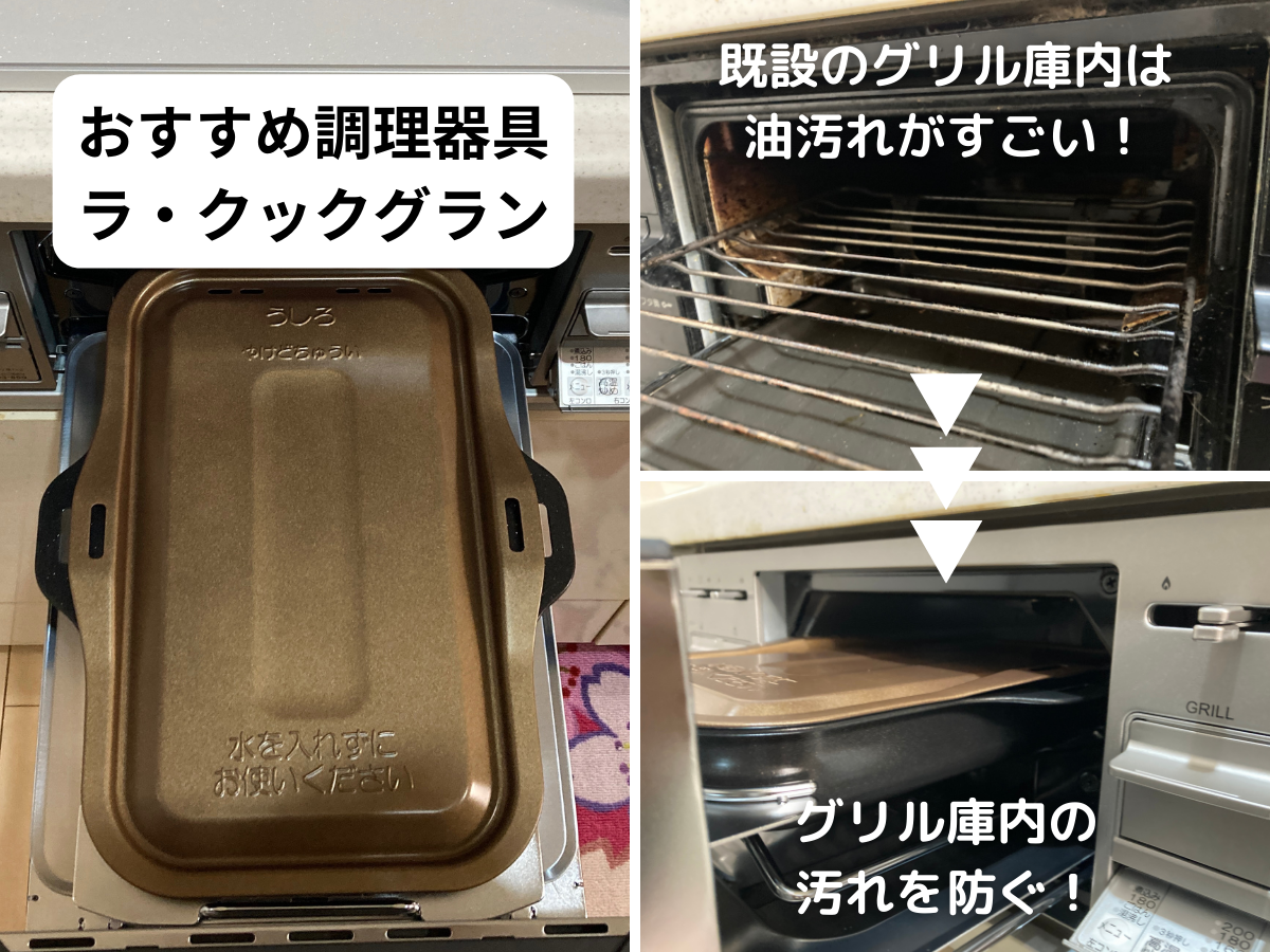 一番のメリットは庫内の汚れを99.9%カットできる事です。既設のグリル庫内は焼き網での調理のため、油汚れの掃除が大変でした。これからは、ふた有りの深型プレートでの調理でグリル庫内が汚れません。また、お手入れもラ・クックグランを洗うだけ!の家事ストレスから解放されます。