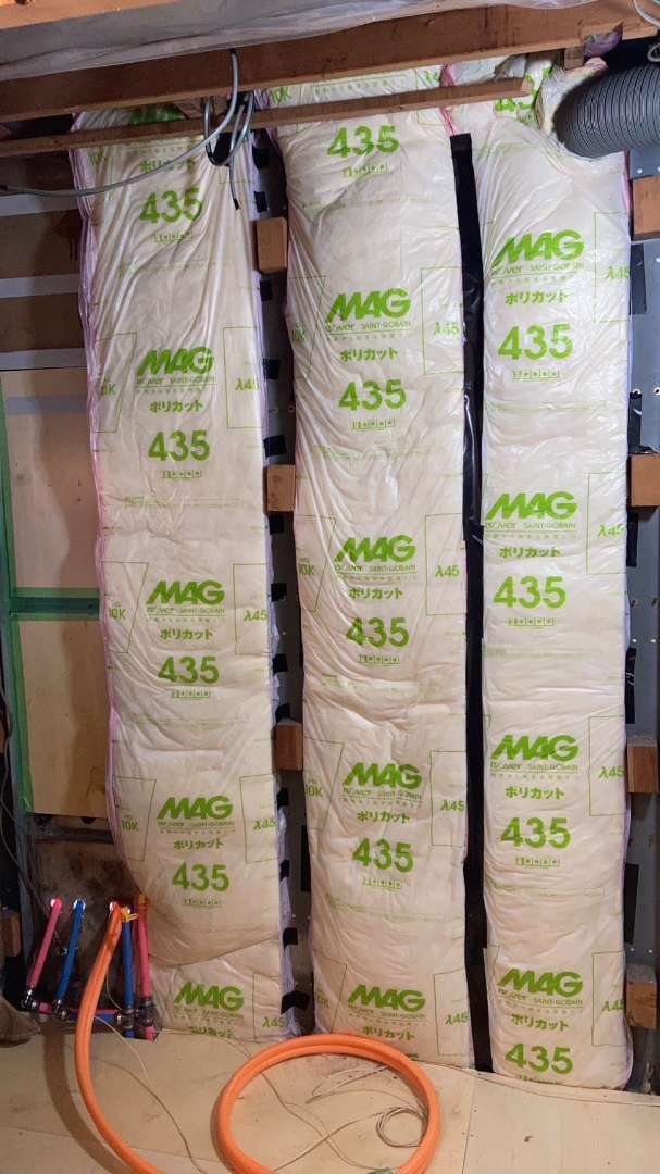 床を薄くても断熱効果のあるスタイロフォームFG、壁は厚み100のグラスウールを施工しました。